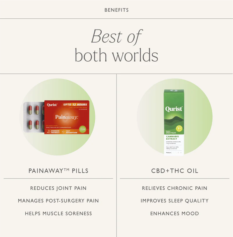 The Qurist Pain Relief Kit combines the strength of Painaway pills and CBD+THC Oil in one value-packed bundle designed to support lasting relief and smoother recovery. Created for those who need dependable, long-duration comfort, this duo is ideal for older adults managing joint concerns, athletes focused on muscle recovery, or anyone with an active lifestyle dealing with everyday aches.